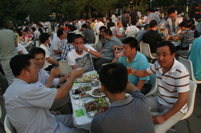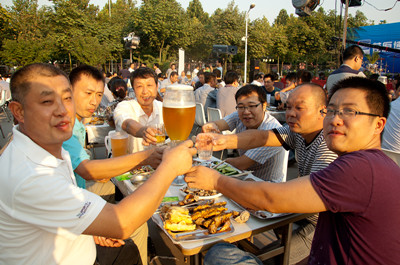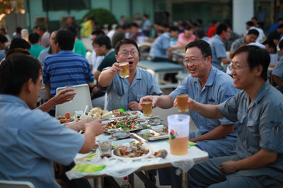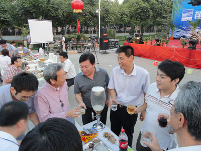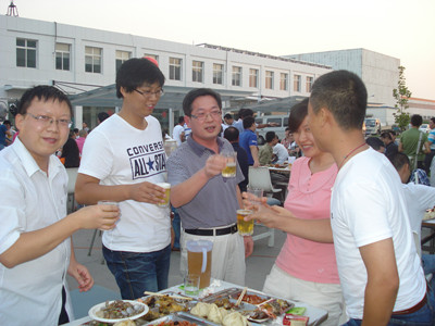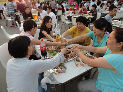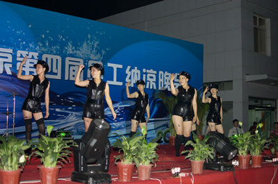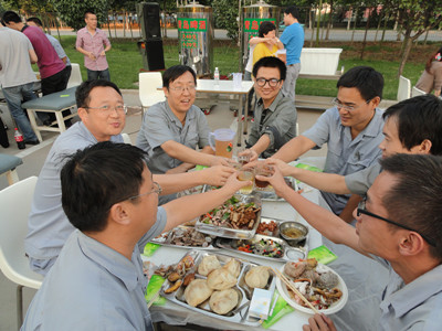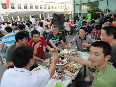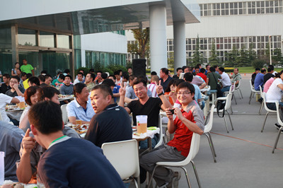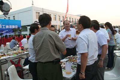 17:30分, “第四屆員工納涼晚會”正式開始。首先是員工聚餐。近400名員工,伴著歡快的樂曲聲,推杯換盞,大快朵頤。公司總經(jīng)理志賀進、常務副總經(jīng)理王正軍等公司領(lǐng)導走入員工中,與員工們親切交談,敬酒祝愿,整個會場洋溢著一張張歡樂的笑臉。